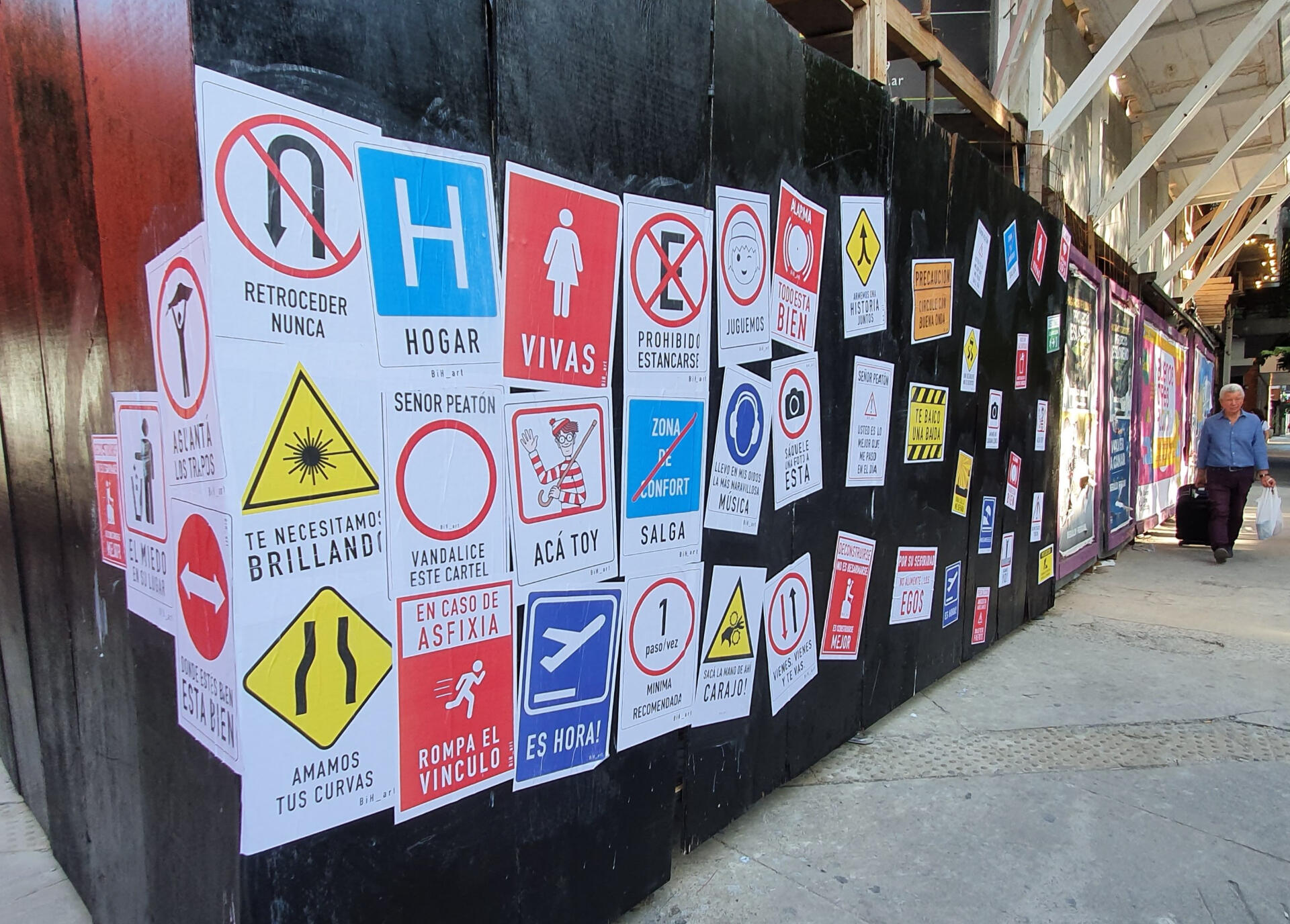 Todos los elementos de una cuadra de la Ciudad de Buenos Aires fueron nombrados con un cartel o etiqueta. Obra realizada en el marco del festival FIBA 2020.