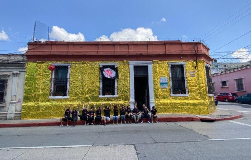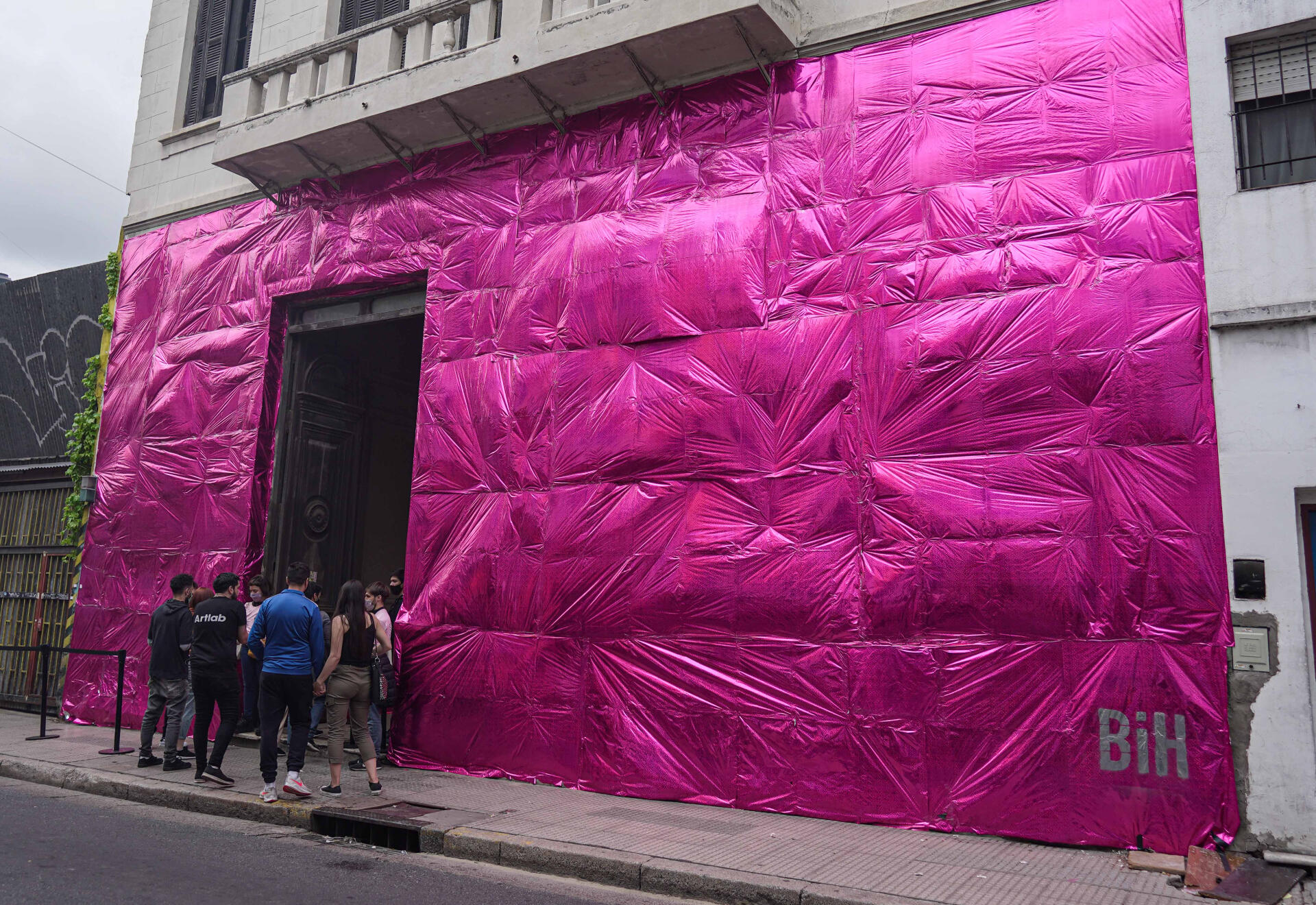 Fachada de Casa Carlos forrada en papel de regalo rosado en el marco del festival Ciudad Emergente.