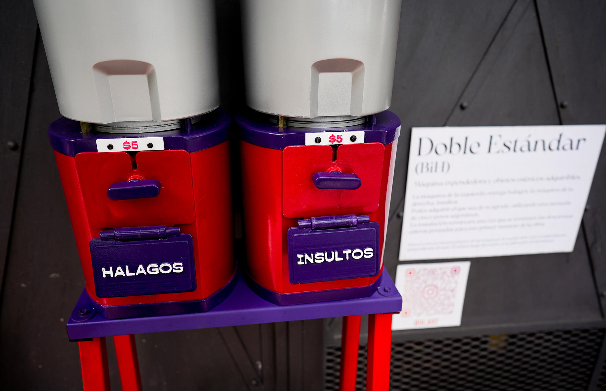 Máquinas expendedoras de juguetes, 200 bolas con insultos y 200 bolas con halagos.