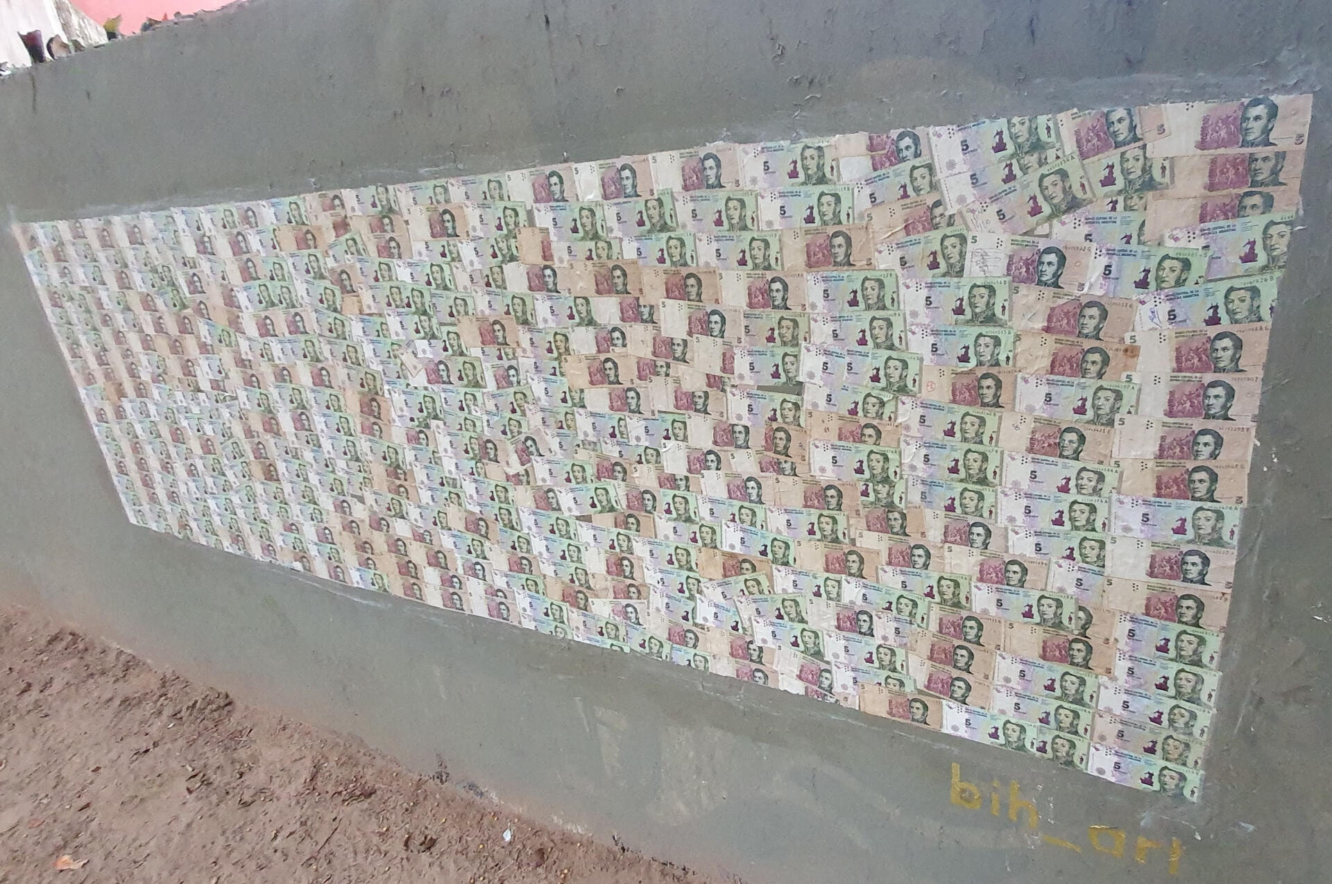 Mural realizado con 400 billetes de 5 pesos argentinos, un mes antes que el mismo salga de circulación