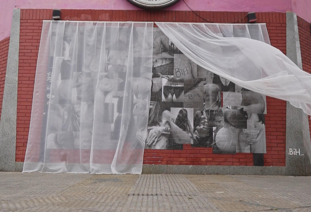Mural colaborativo en papel y cortinas de voile. 4.5 mts x 3 mts.