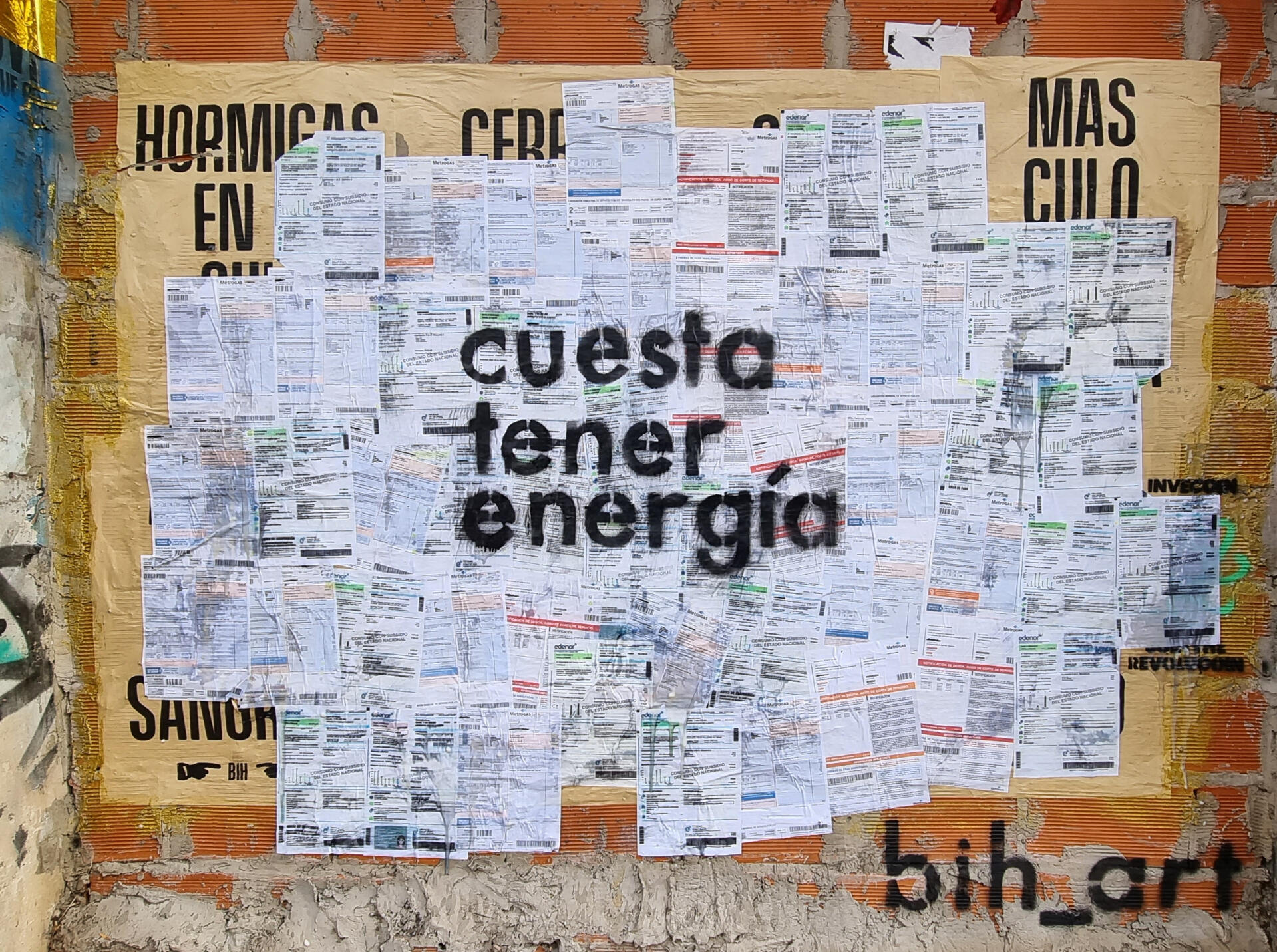 Stencil, pintura en aerosol sobre facturas de gas y electricidad de los últimos 24 meses previos a la realización de la obra.