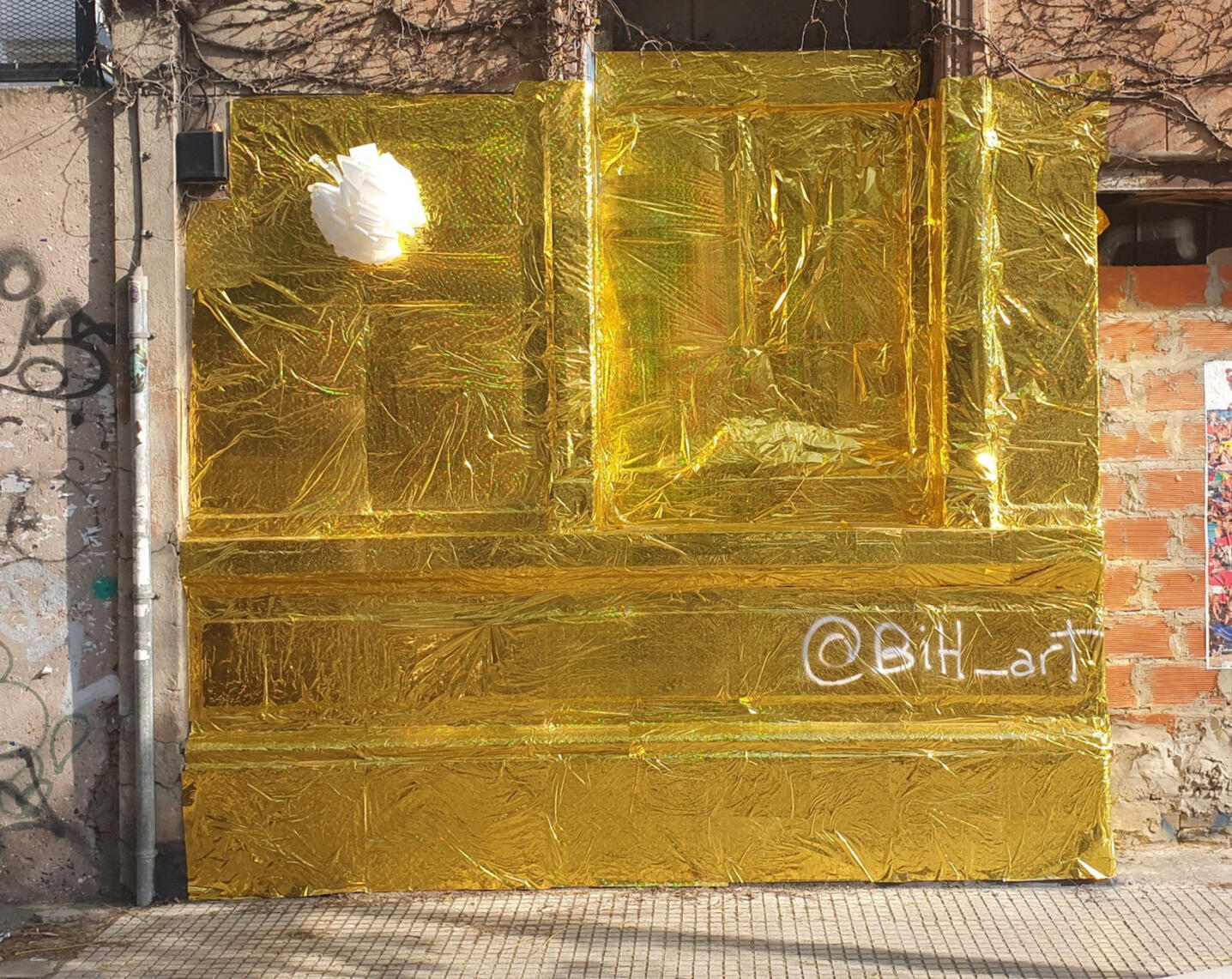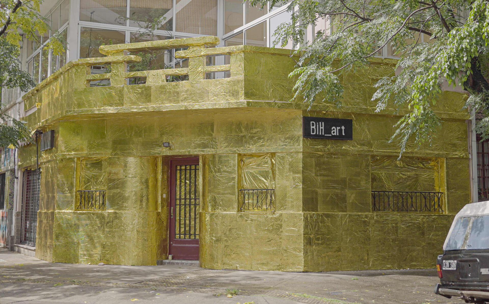 Casa a punto de ser demolida forrada con 120 m2 de papel de regalo dorado.