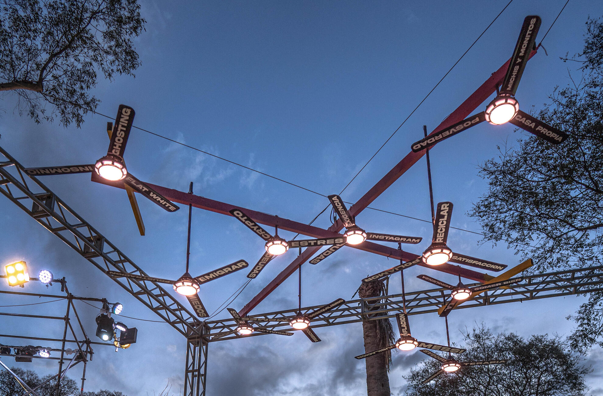 11 ventiladores de techo intervenidos con palabras representativas de la generación millennial, girando a velocidad variable.
