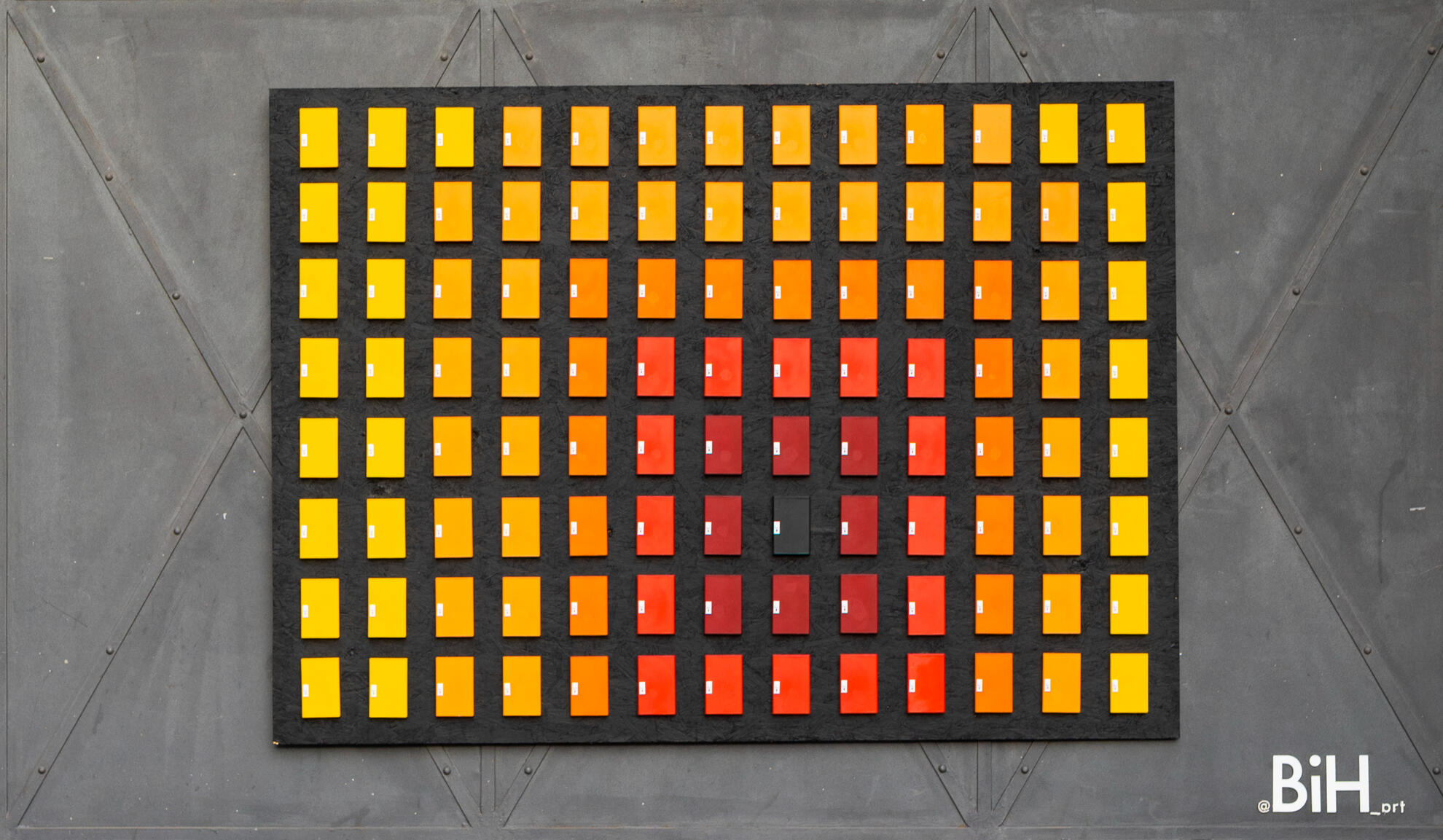 104 cajas de cassete, impresión 3D, plotteo, pintura en aerosol sobre placa de OSB negra.